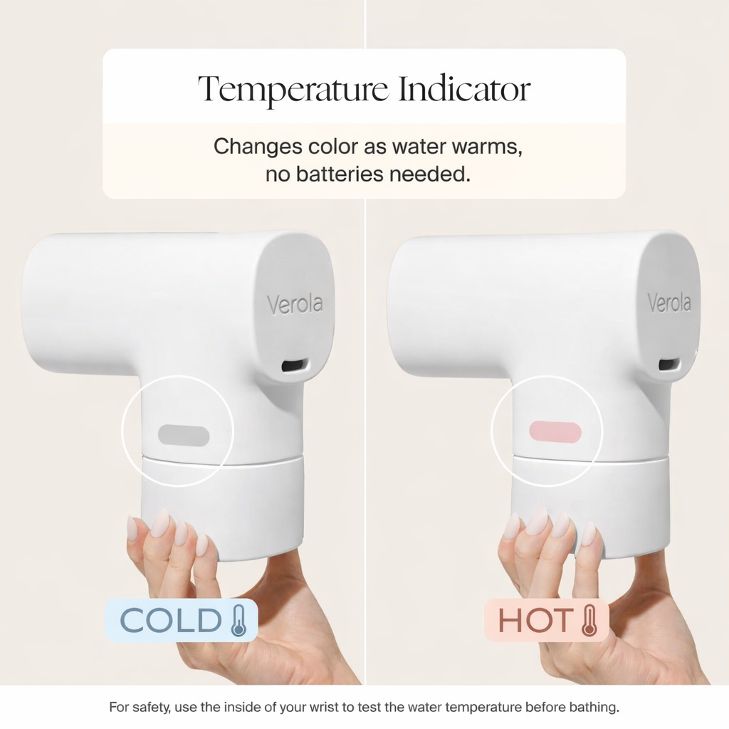 Verola™ helps reduce chlorine and other common water irritants that can leave skin feeling dry, tight, or reactive. By filtering the bath water before it touches your child’s skin, it creates a noticeably gentler soak — especially for sensitive or eczema-prone skin.